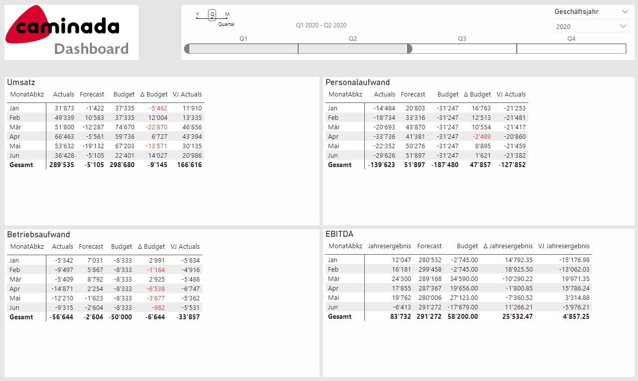 Feedback from customers and our own experience have confirmed that the "Caminada Dashboard" is a very valuable management tool. Quick and easy to understand, you get an insightful overview of your company's financial data and KPIs in just a few minutes, see current developments, and can derive alternative courses of action.