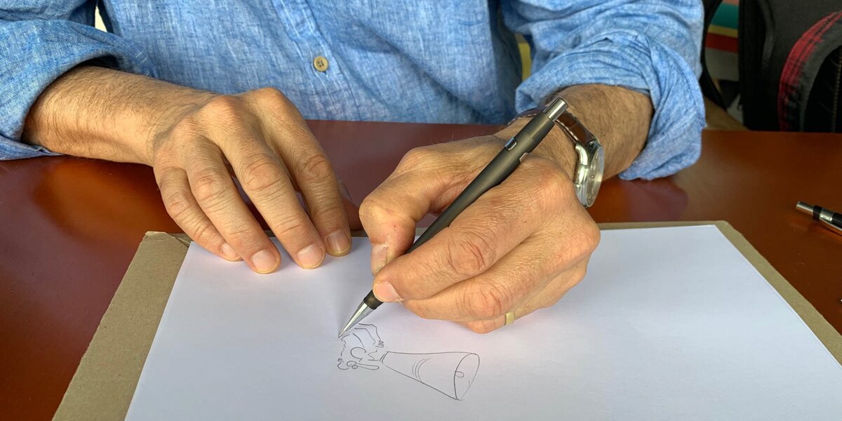 Max Spring, equipped with pen and paper, let his creativity bubble during our meeting and put our stories and ideas directly on paper. Back in his studio, the sketch was turned into a colourful cartoon. Between the first sketch and the final cartoon, there are various work steps - including digital ones. Max usually creates a drawing several times. The individual elements are first drawn with ink on paper. The various partial drawings are then glued together in the desired order to form a patchwork and then photocopied onto high-quality paper. In the next step Max colours the cartoon with watercolour and brush. Finally, he carries out some post-processing operations in the scanned document if considered necessary. And with this the masterpiece is finished.
